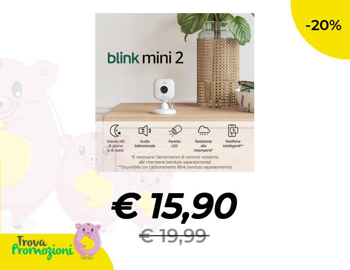 ๐๐ผ Blink Mini 2 | Videocamera intelligente di sicurezza, plug-in, con visione notturna a colori HD, faretto integrato, audio bidirezionale, rilevazione di movimento, funziona con Alexa | Bianco