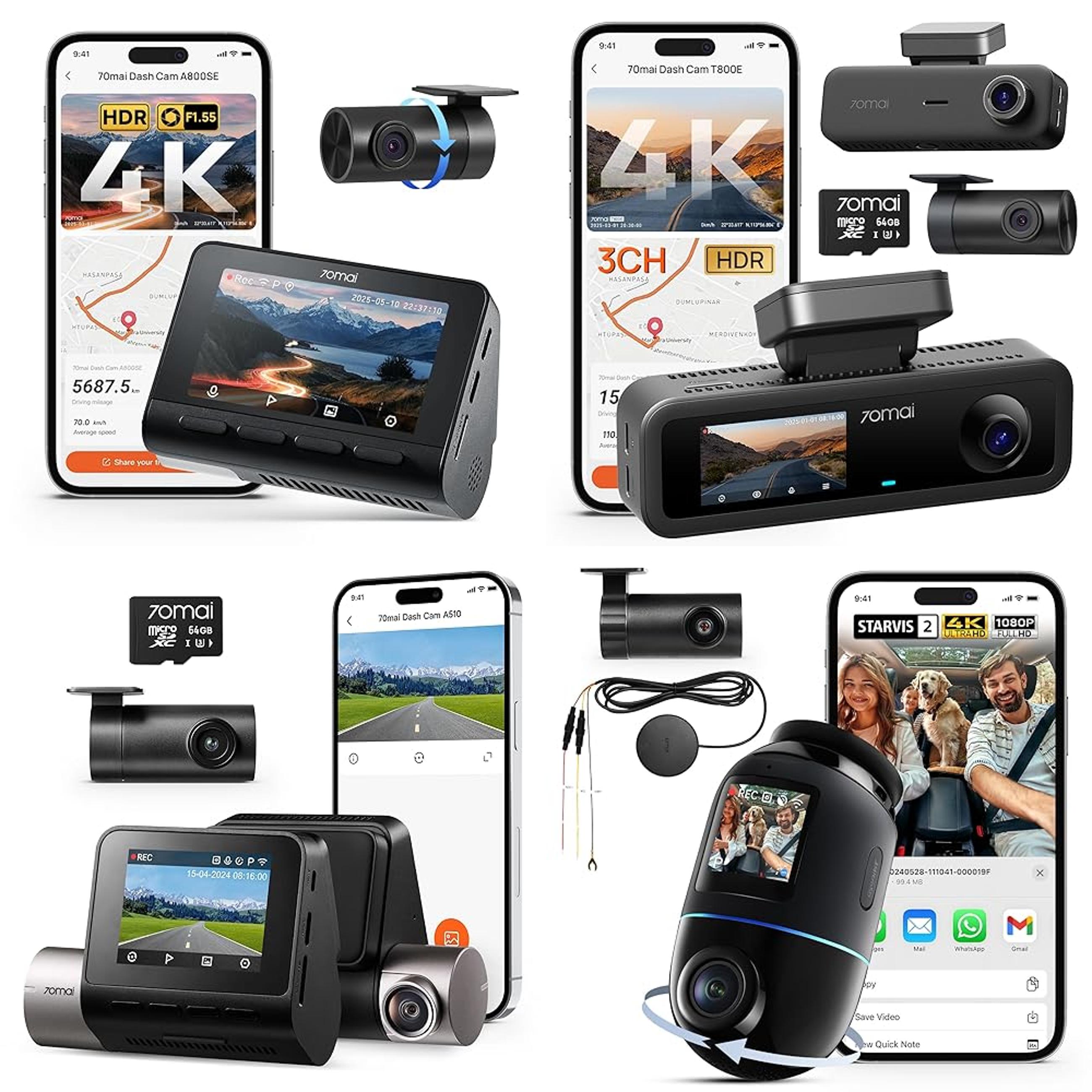 ๐๐ผ70mai Dash Cam Auto 4K 3 Canali T800E, Telecamera Tripla Anteriore e Posteriore 4K+1080P+1080P, HDR, Visione Notturna IR, Modalitร Parcheggio, F1.55, GPS, Supercondensatore, 64 GB SD Inclusa