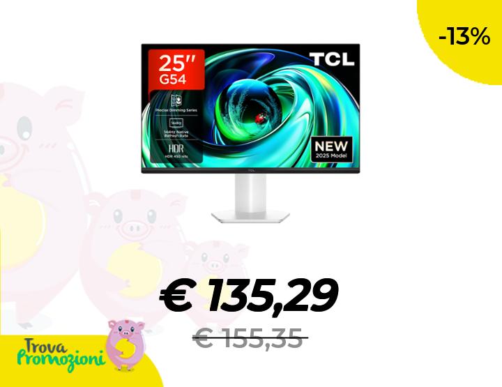 ๐๐ผ TCL Gaming Monitor 25G54 mini-LED da 25", risoluzione FHD, 144 Hz, pannello IPS, 450 nit, VESA Display HDR 400, 93% DCI-P3 Wide Color Gamut, certificazione TรV Rheinland Flicker-Free e Low Blue Light