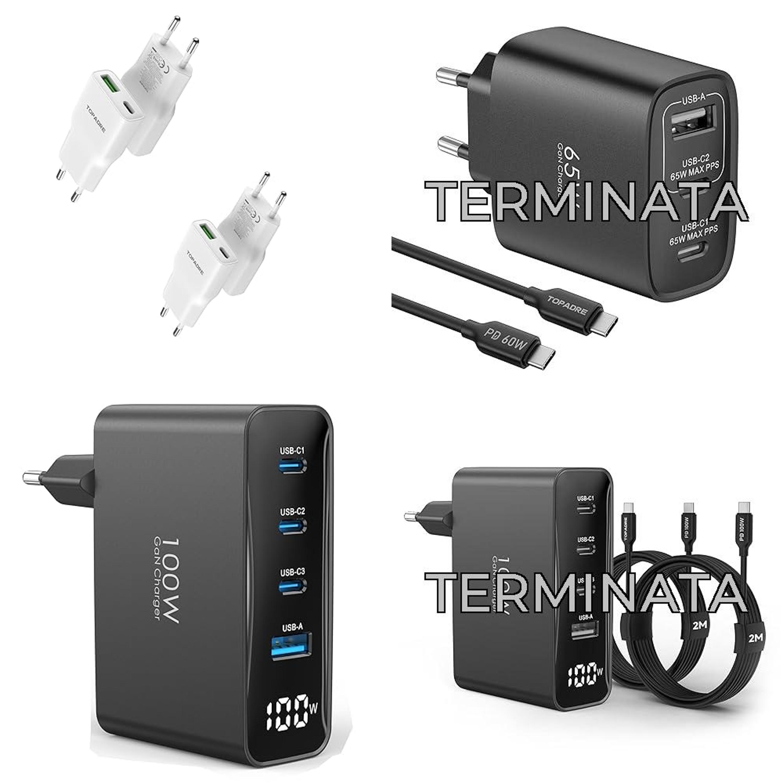 ๐๐ผTOPADRE Caricabatterie USB-C da 100 W, adattatore di alimentazione USB-C con due cavi da 2 m e display LED, caricabatterie rapido multiporta GaN a 4 porte per iPhone 16,15, MacBook Air e Galaxy. Nero