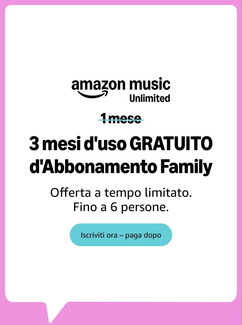 ๐Ÿ’ฃ Fino al 2 aprile 2026. se ti iscrivi per la prima volta ad Amazon Music Unlimited Family, otterrai ben 3 mesi di servizio GRATIS e potrai disdire quando vorrai! E da oggi un audiolibro Audible al mese รจ incluso nel prezzo!