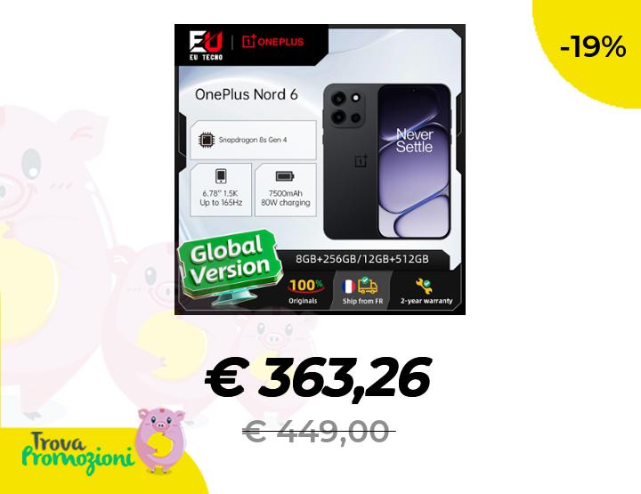 ๐๐ผ 2026 Nuovo smartphone OnePlus Nord 6 5G 8 GB + 256 GB / 12 GB + 512 GB, Snapdragon 8s Gen 4, 165 Hz, 7500 mAh, IP69/IP69K, versione globale