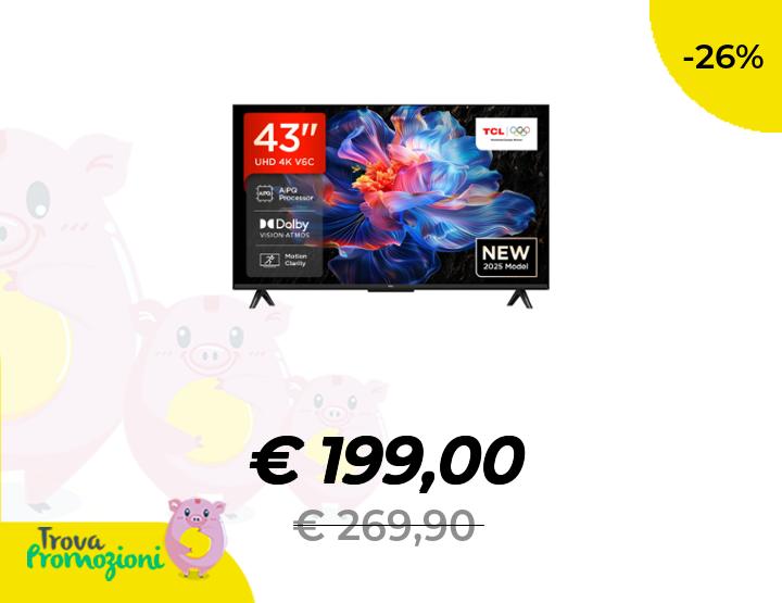 ๐๐ผ TCL 43V6C TV 43" 4K UHD Smart LED TV, 4K HDR, Google TV con design senza bordi (Dolby Audio, Motion Clarity, compatibile con Google Assistant e Alexa)
