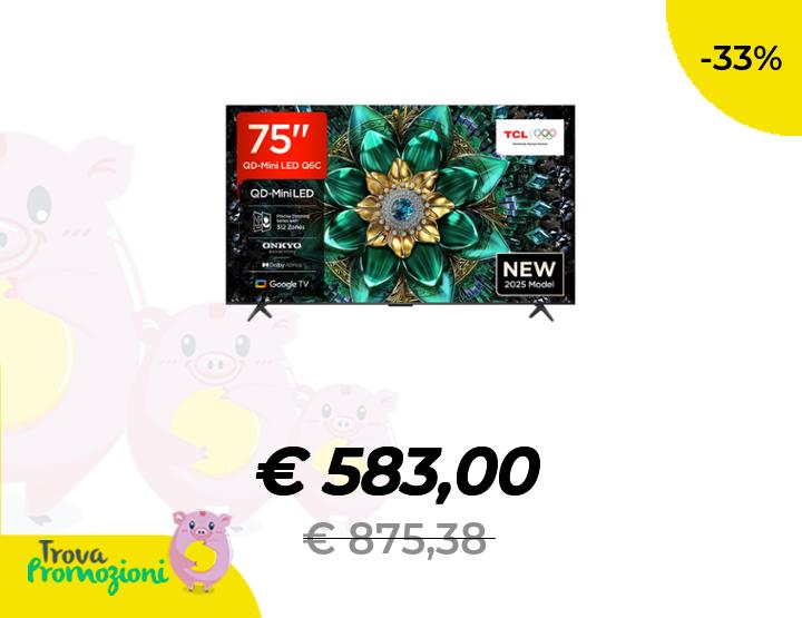 ๐๐ผ TCL 75Q6C 75" QD-Mini LED SMART TV, 4K HDR Premium 1000nits, con tecnologia Google TV (Dolby Vision IQ e Atmos, sistema audio Onkyo 2.1, Motion Clarity Pro a 144 Hz, Game Master)