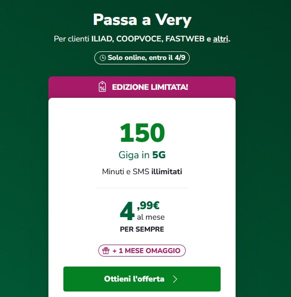 ๐๐ผ ORA CON 5G E UN MESE OMAGGIO - Passa a Very con 150GB in 5G, minuti e SMS illimitati a soli 4,99โฌ al mese