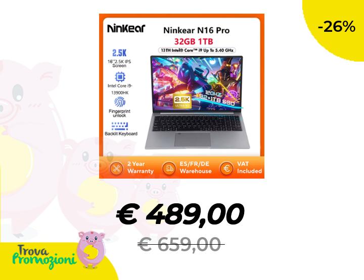๐๐ผ Ninkear N16 Pro Laptop 32GB 1TB 13th Intel Core i9-13900HK 16'' 2.5K IPS 120Hz Computer da gioco 57.75Wh Notebook con sblocco delle impronte digitali