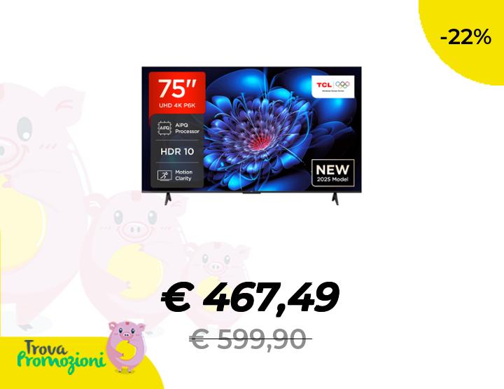 ๐Ÿ‘‰๐Ÿผ TCL 75P6K TV LED Direct da 75", TV HDR 4K, Smart TV con tecnologia Google TV (Dolby Audio, Motion Clarity, compatibile con Google Assistant e Alexa)
