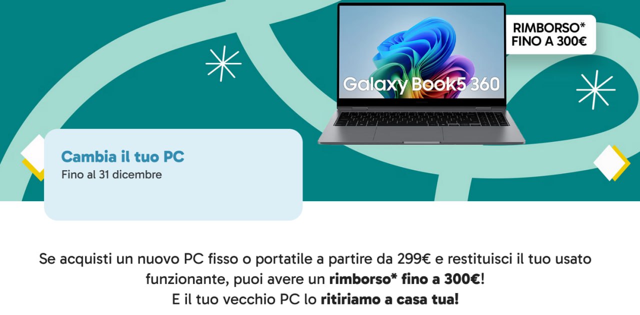 ๐ก Se acquisti un nuovo PC fisso o portatile a partire da 299โฌ e restituisci il tuo usato funzionante (desktop con desktop o mini pc e Notebook con Notebook), puoi avere un rimborso fino a 300โฌ!