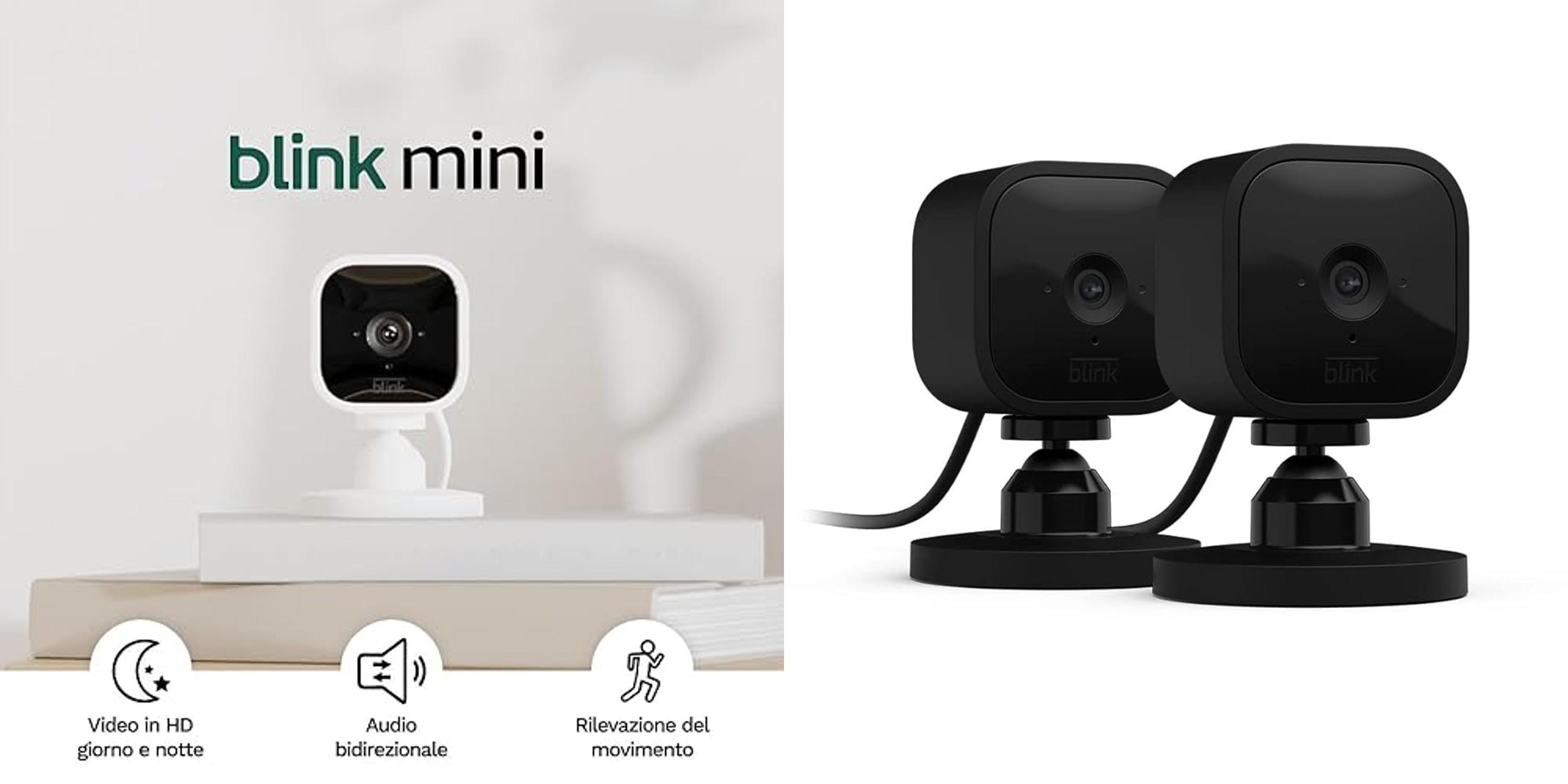 ๐๐ผBlink Mini - Videocamera di sicurezza intelligente per interni, plug-in, video HD 1080p, rilevazione di movimento, audio bidirezionale, config. semplice, compatibile con Alexa | 2 videocamere (Nero)