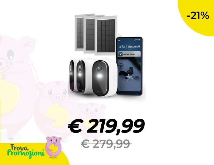 ๐๐ผ Arlo Essential 3 HD + 3 pannelli solari, videocamera WiFi esterna, batteria 6 mesi, visione notturna, audio bidirezionale, 3 camere bianche