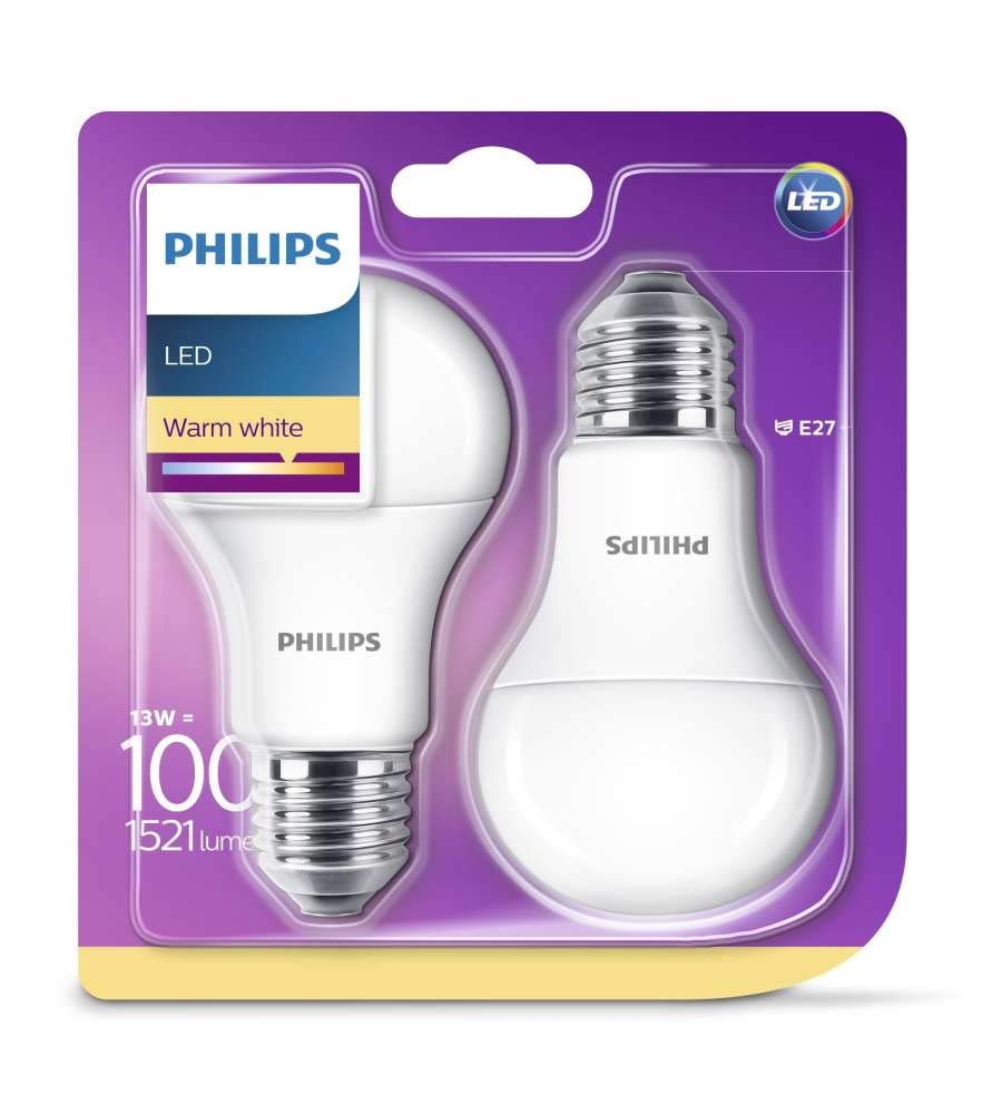 ๐๐ป Philips Lighting Lampadina LED, Warm White Goccia, Attacco E27, 13 W Equivalenti a 100 W, 2700K, Blister Doppio, Bianco, 2 unitร - 1521 lm