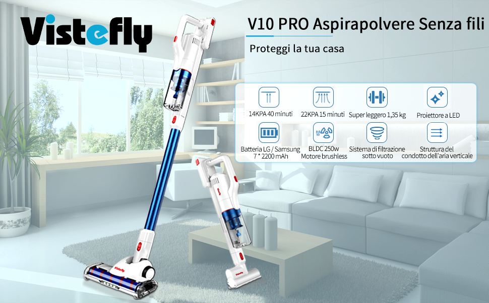 👉🏼Vistefly V10 Pro Aspirapolvere Senza Fili,22000pa Potente Motore Brushless 250W e una batteria da 2200 mAh, sufficiente per circa 40 minuti di funzionamento in modalitá normale. - Con spazzole e accessori inclusi in confezione!