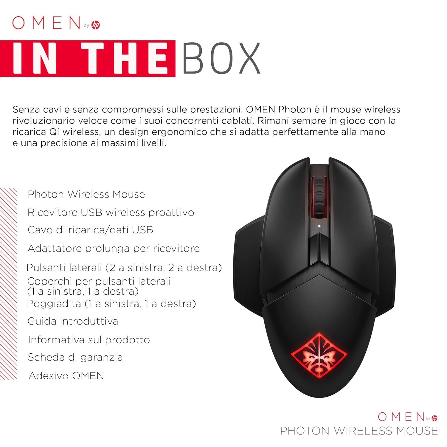 ππ»HP - Gaming Omen Photon Mouse Gaming Wireless, Ricarica Qi Wireless, 11 Tasti Programmabili, Tempo Risposta 0.2 ms, DPI da 100 e 16000, Sensore Ottico PixArt PAW3335, LED RGB Personalizzabili