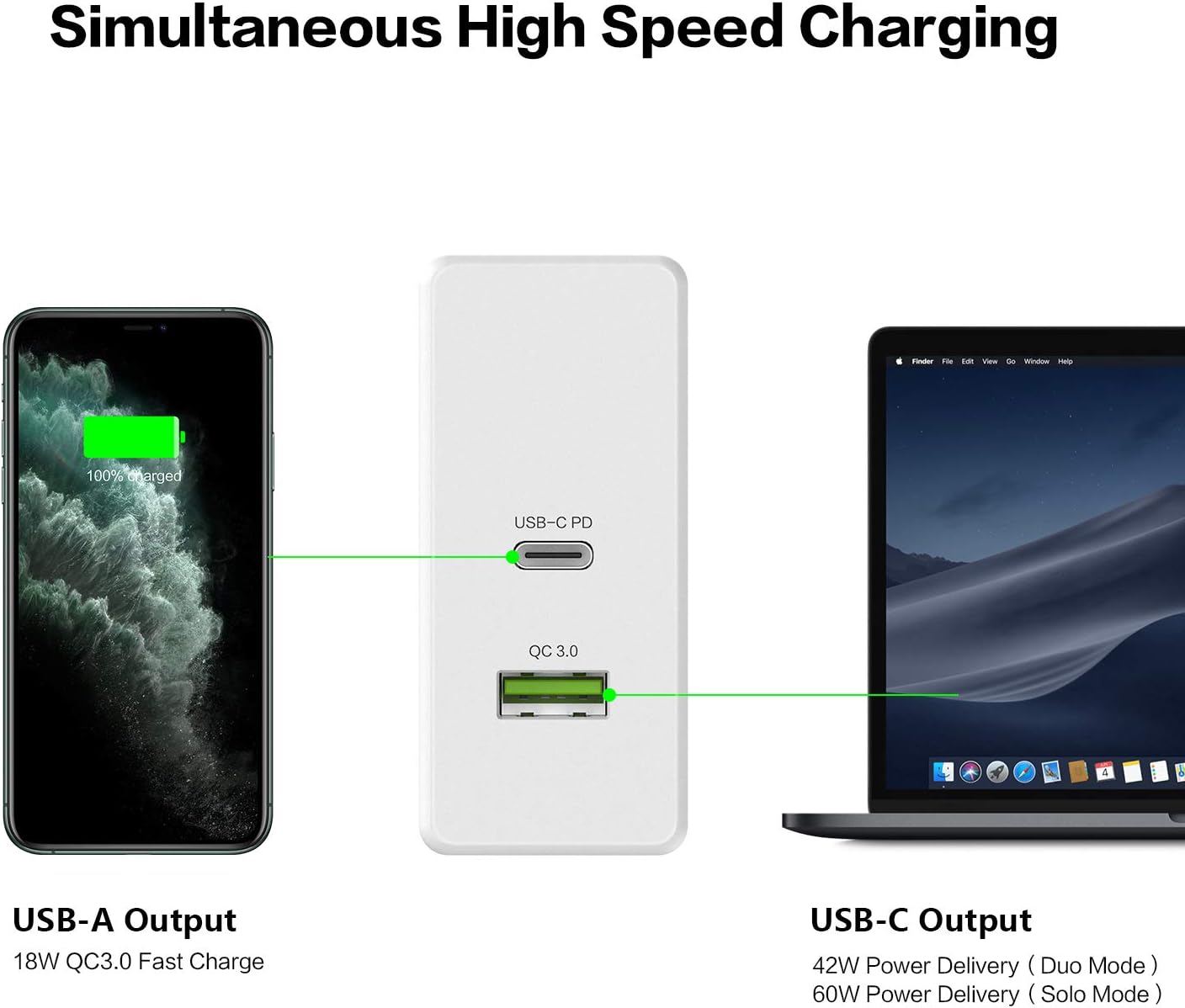 ππΌ Lecone Caricatore USB C 60W, con una porta Type C fino a 48W Power Delivery e una porta USB QC 3.0 da 18 W