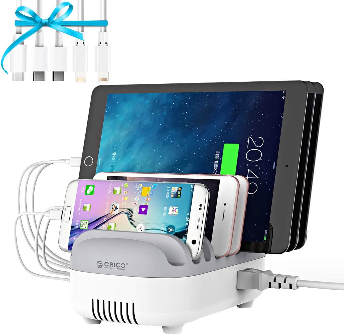 ๐๐ผ ORICO 40W con 5 Cavi Caricabatterie Smart USB con Supporto per Telefono Cellulare e Tablet - 5 cavi inclusi in confezione: 2 Type C, 2 Lightning e uno MicroUSB