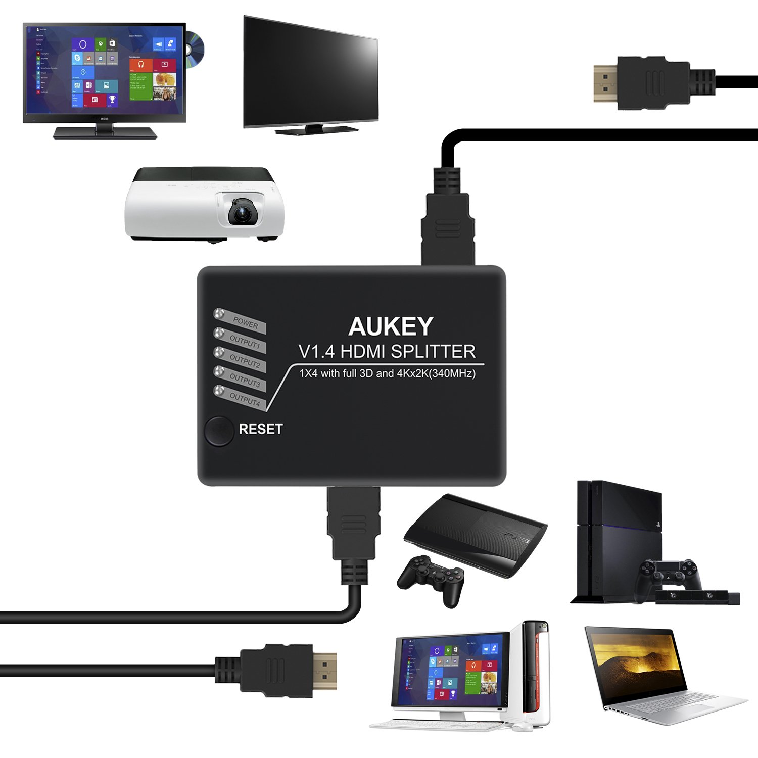 ๐๐ปAUKEY Splitter HDMI 1 Ingresso 4 Uscite - 3D 4K Amplificatore 1 X 4 per PC , DVD , HDTV , PS3 , Xbox , Proiettori HDMI ecc.