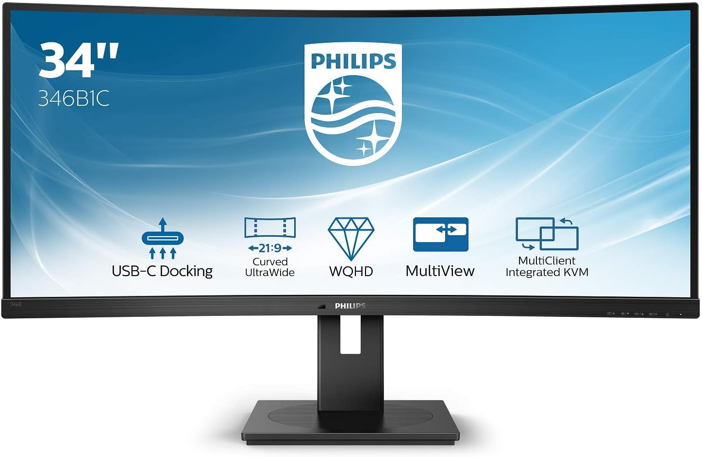 ๐๐ผ Philips 346B1C Gaming Monitor Curvo 34" 21:9 WQHD, 100 Hz, Adaptive Sync, Multiview (PiP, PbP), KVM e Audio Integrati, HDMI, Display Port, Docking Station USB-C, RJ45, Regolabile Ergonomicamente, Vesa