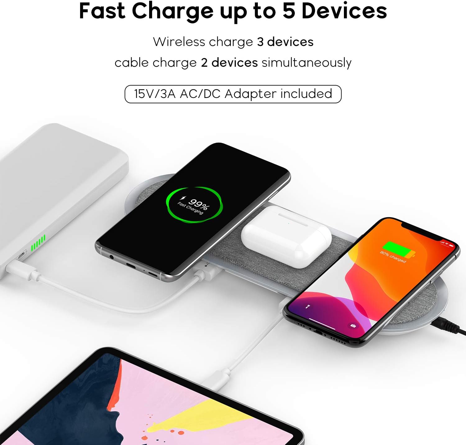 ๐Ÿ‘‰๐Ÿป Caricatore Wireless Lecone con standard QI e ricarica veloce fino a 10W - 3 Slot per la ricarica Wireless e ulteriori 2 porte USB per la ricarica cablata - Occorre usare un caricatore compatibile QC 3 per avere la ricarica rapida! - Alimentatore incluso in confezione