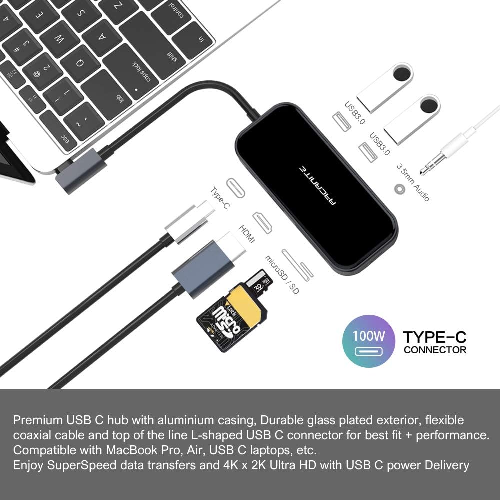 ๐๐ผ ARCANITE, Hub USB-C premium, output 100 W, 4K x 2K HDMI, Gigabit Ethernet, 2 porte USB 3.0 Type-A, esterno in alluminio e vetro - anche con lettore schede microSD e SD, jack audio da 3,5 mm