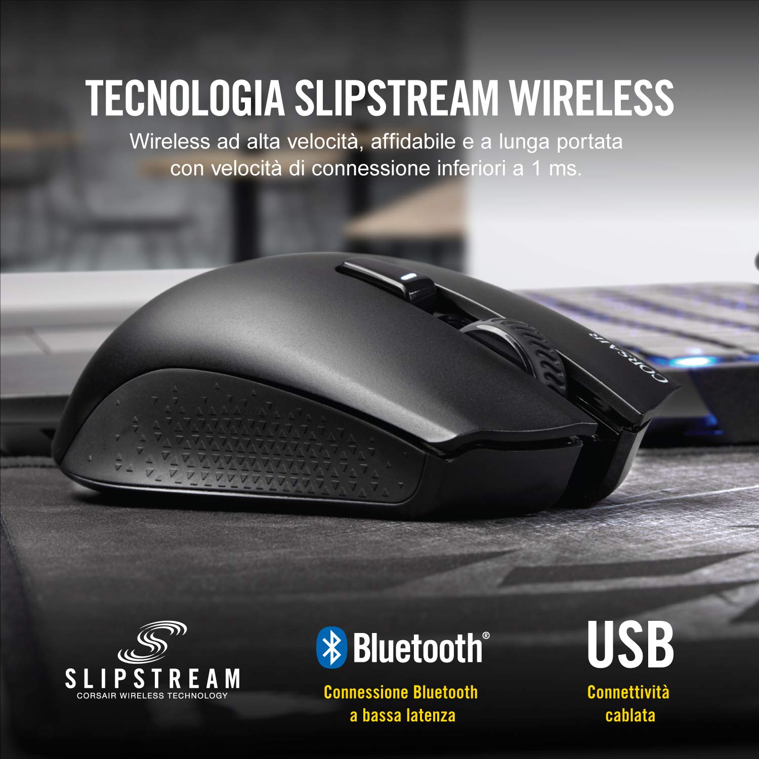 🔸 Gioca con la superveloce TECNOLOGIA SLIPSTREAM CORSAIR WIRELESS con latenza inferiore a 1 ms, oppure utilizza la connessione Bluetooth a bassa latenza o un cavo USB