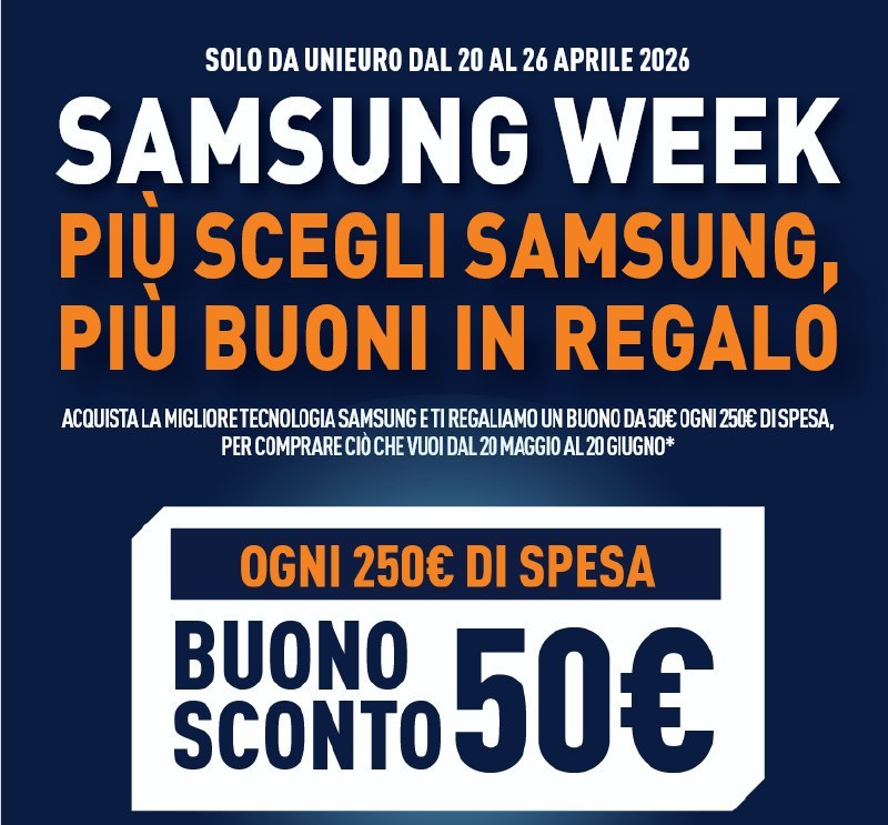 ๐๐ผ Speciale Samsung Week Unieuro: 50โฌ di buoni ogni 250โฌ di spesa fino al 26 Aprile