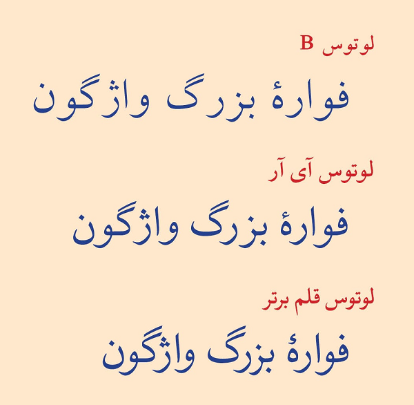 🔻 مقایسۀ این سه فونت از نظر زیبایی و ترکیب هم که دیگر به توضیح نیاز ندارد. از این نظر هم به نظر من آی آر بینابین است. البته ممکن است در چشم کسانی، آی آر از قلم برتر بهتر به نظر بیاید، به ویژه کسانی که هنوز با قلم برتر انس نگرفتهاند.