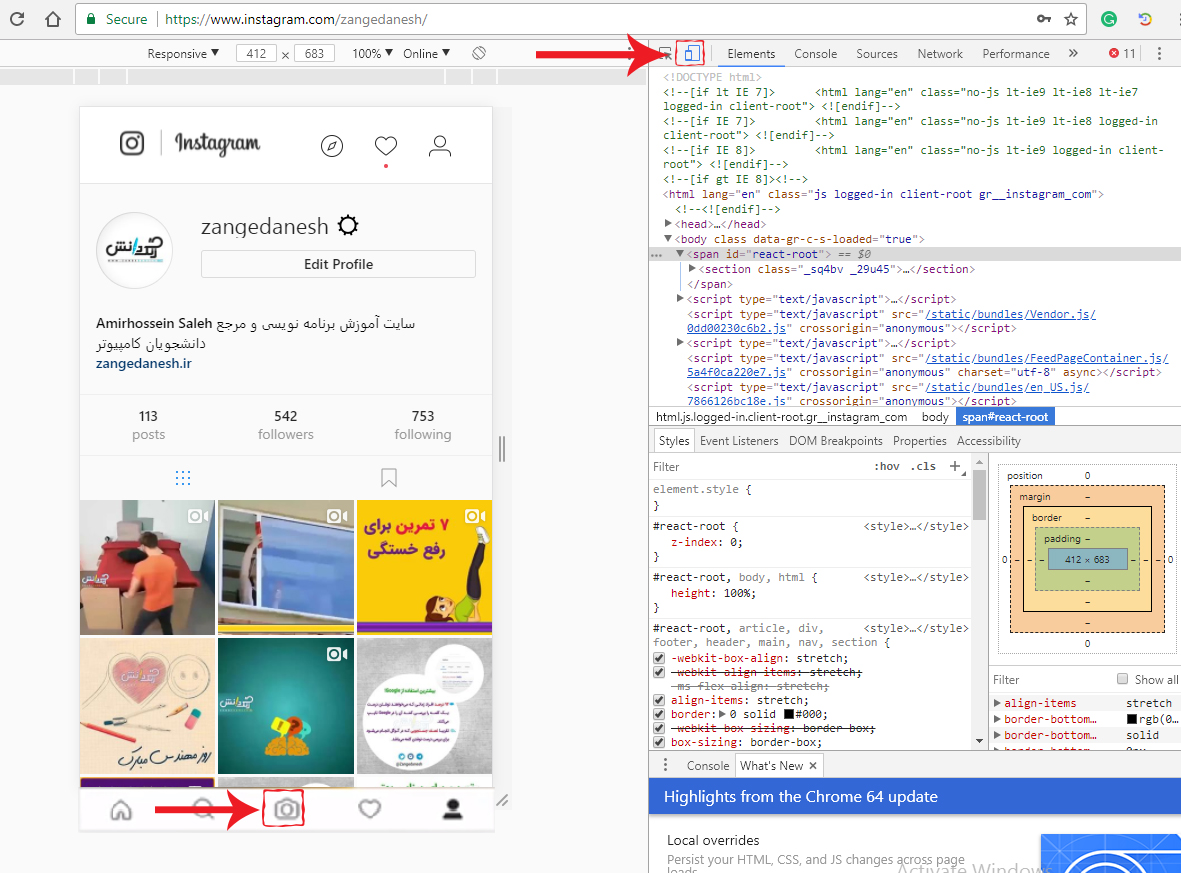 در کنار گزینه Elements یک آیکونی وجود دارد که شبیه به تبلت می‌باشد با زدن آن دگمه، اینستاگرام شما به شکل اینستاگرام گوشی در می‌آید و از گزینه‌ دوربین که در پایین مشخص شده است می‌توانید تصویر یا ویدیوی خود را آپلود کنید. سپس یکبار با F5 صفحه خود را Refresh کنید.