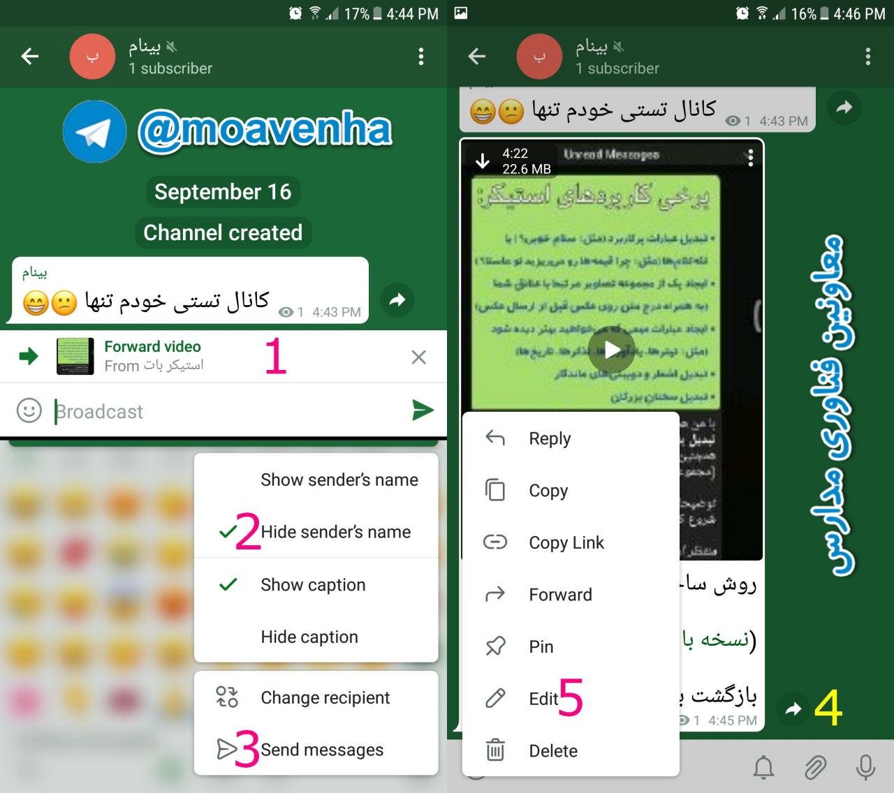 🔸اما اگر هدف شما این است که نام/کانال منبع نمایش داده نشود اما از طرفی، نمی‌خواهید به اسم خود شما هم فوروارد نشود یا می‌خواهید که در زیرنویس آن ویرایشی انجام دهید، کافی است که یکبار، ده ثانیه وقت بگذارید و یک کانال خصوصیِ تک‌نفره برای خودتان بسازید؛ مثلاً به‌نام «بینام» و سپس مطلب موردنظر را به آنجا فوروارد کنید و در آنجا ویرایش لازم را روی زیرنویس آن انجام دهید (شمارهٔ ۵ در تصویر زیر) و سپس به هر جا دوست دارید بفرستید (شمارهٔ ۴).