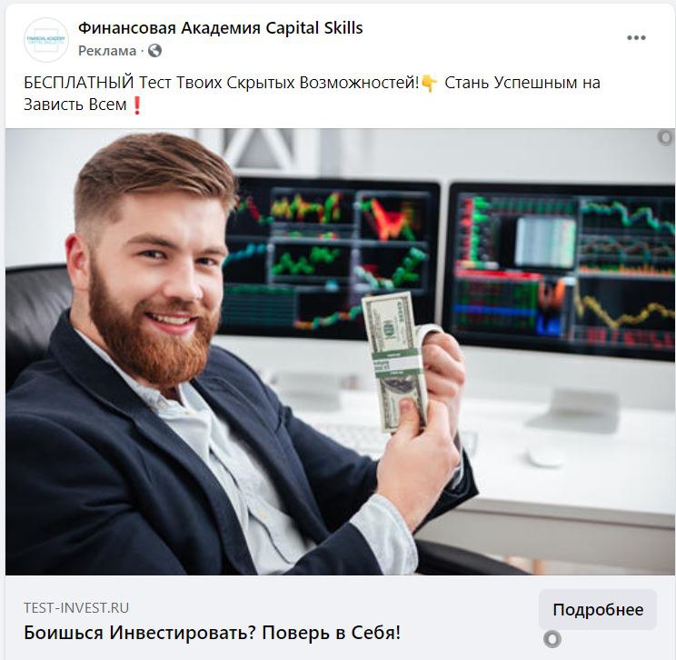 В Facebook рекламируется сайт test-invest .ru, принадлежащий «Финансовой академии Capital Skills» (набережная академика Туполева, ом 15, корпус 22, 5 этаж, офис 502.