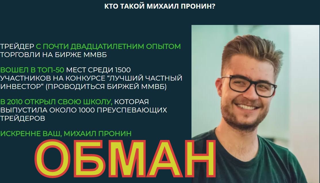 Жулики придумали ещё одного несуществующего успешного трейдера, якобы предлагающего бесплатный курс по трейдингу. Михаил Пронин. Цель: заполучить телефоны не слишком умных людей.