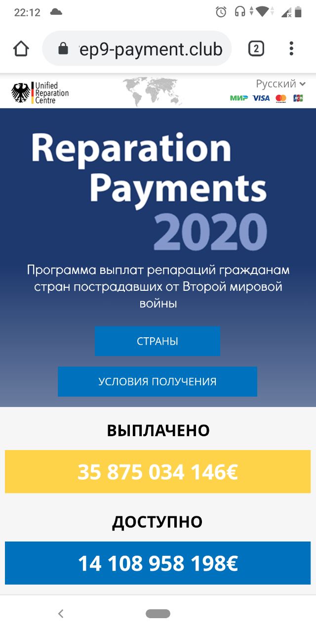 ​​В Ютубе идёт реклама видео, с предложением выплаты компенсации от правительства Германии (якобы за Вторую мировую войну). При переходе на сайт собирают данные банковских карт, позже мошенники стараются в общении по телефону узнать пароль.