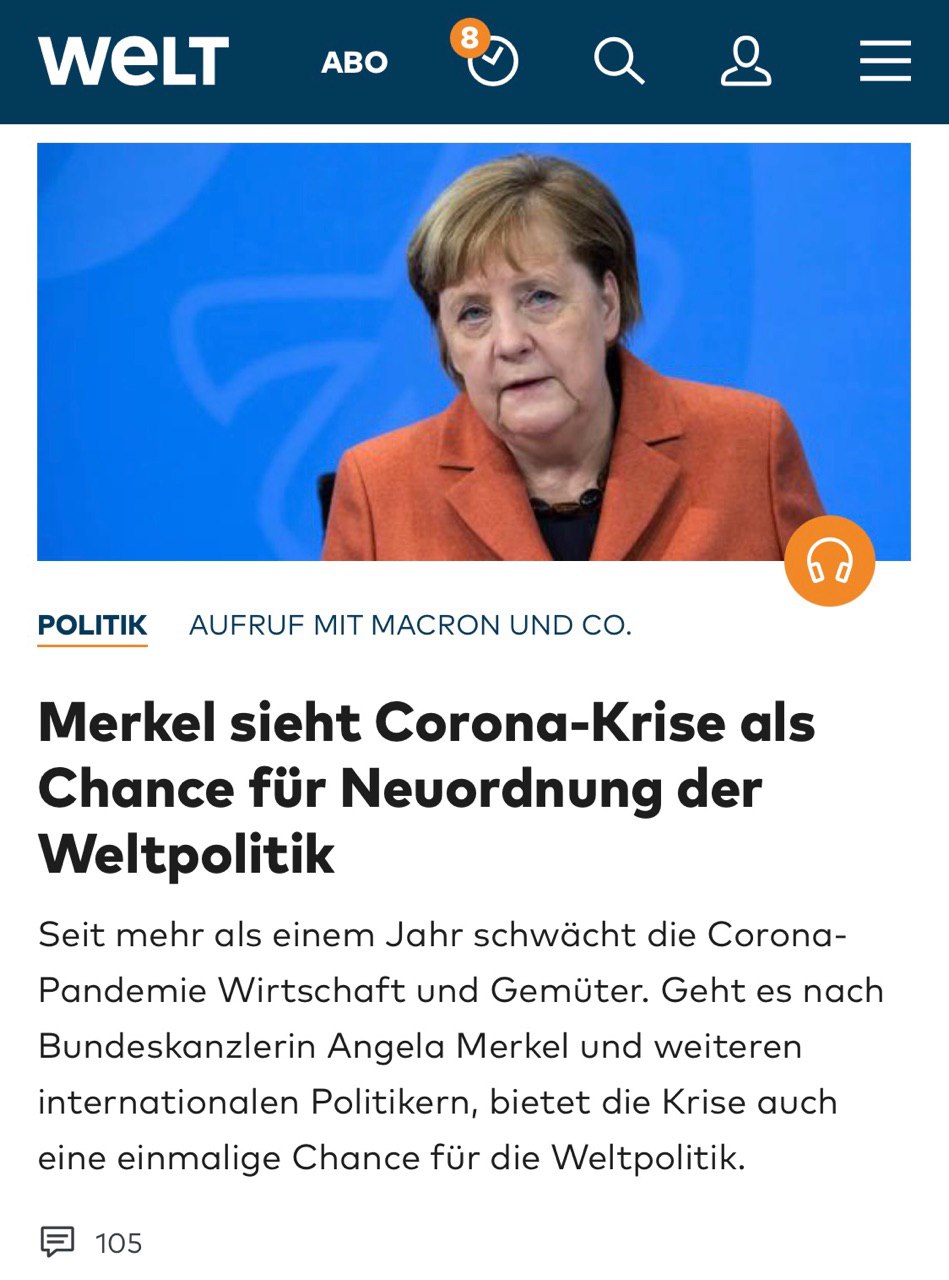 Sie reden mittlerweile Klartext. Neue Weltordnung, Great Reset. Maskenzwang im Auto, in der Schule, der Bürger als Knecht... so der Traum der Merkel-Regierung.
