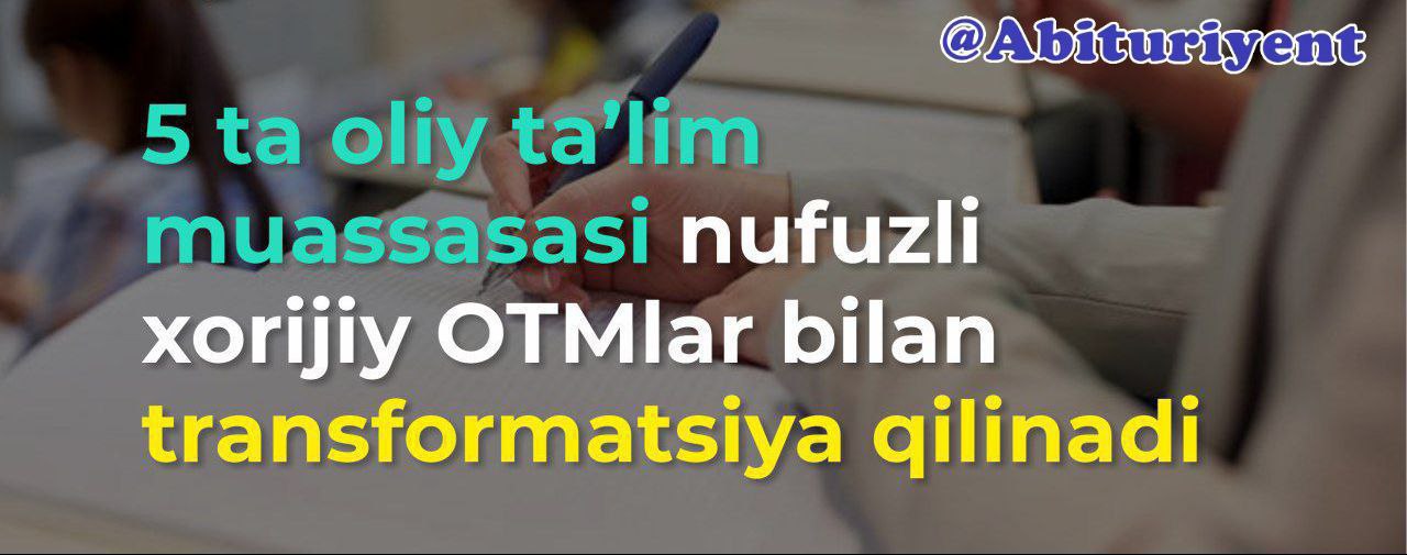 Hukumat qarori (655-son, 27.10.2020 y)ga muvofiq, 2021 yil 1 martga qadar transformatsiya qilish uchun 5 ta OTM ochiq tanlov asosida saralab olinadi. Deb xabar beradi xuquqiy axborot kanali.