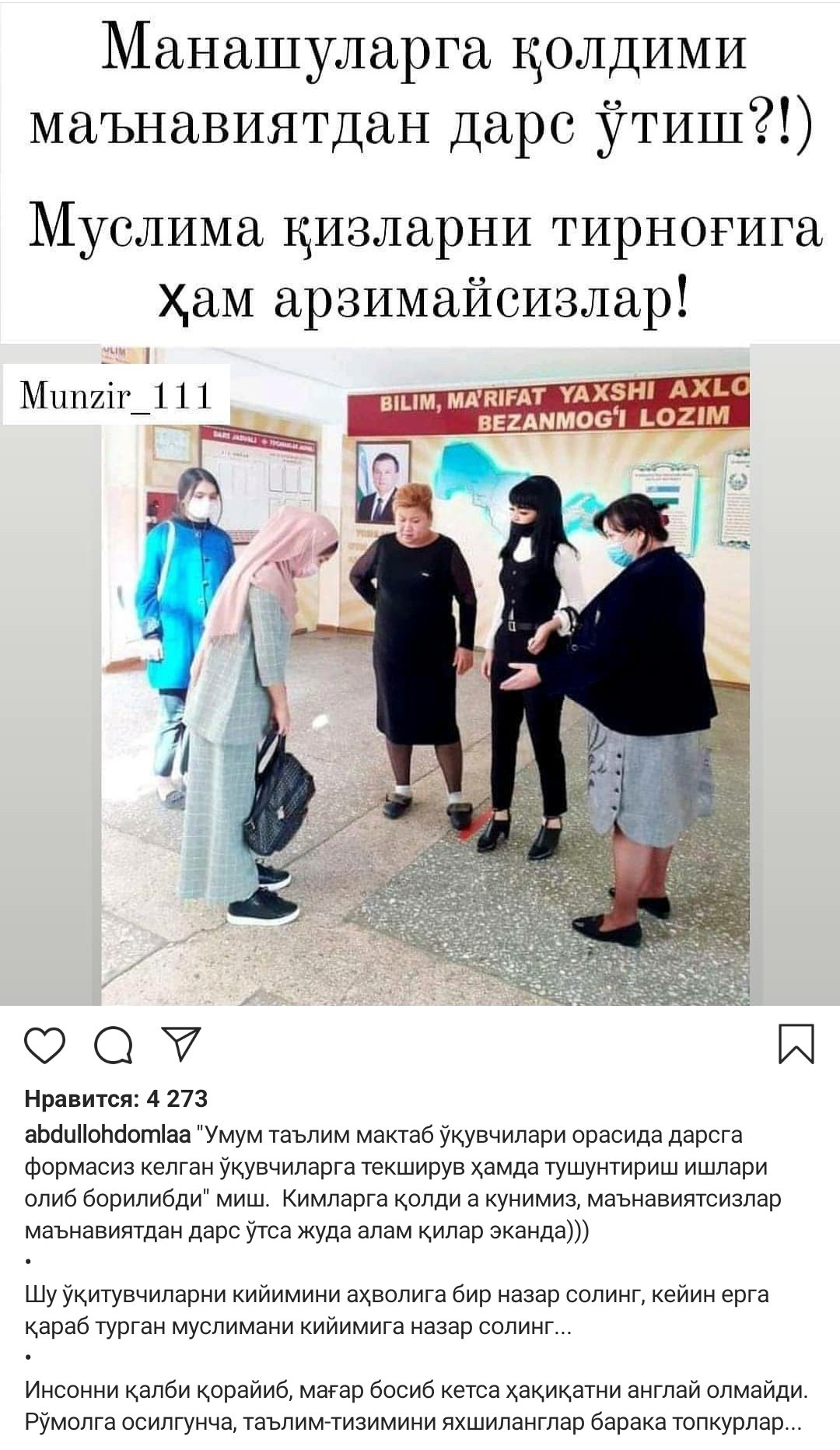 3️⃣ Uchinchidan, siz qizni aynan hijob o‘rgani uchun maktabga kiritmasligingiz bu O‘zbekiston Respublikasi Konstitusiyasining 19-moddasi, Vijdon erkinligi va diniy tashkilotlar to‘g‘risidagi qonunda belgilangan shaxsning dini va e’tiqotidan qat’iy nazar qonun oldida tengdir degan normalarning buzilishiga sabab bo‘lmoqda.