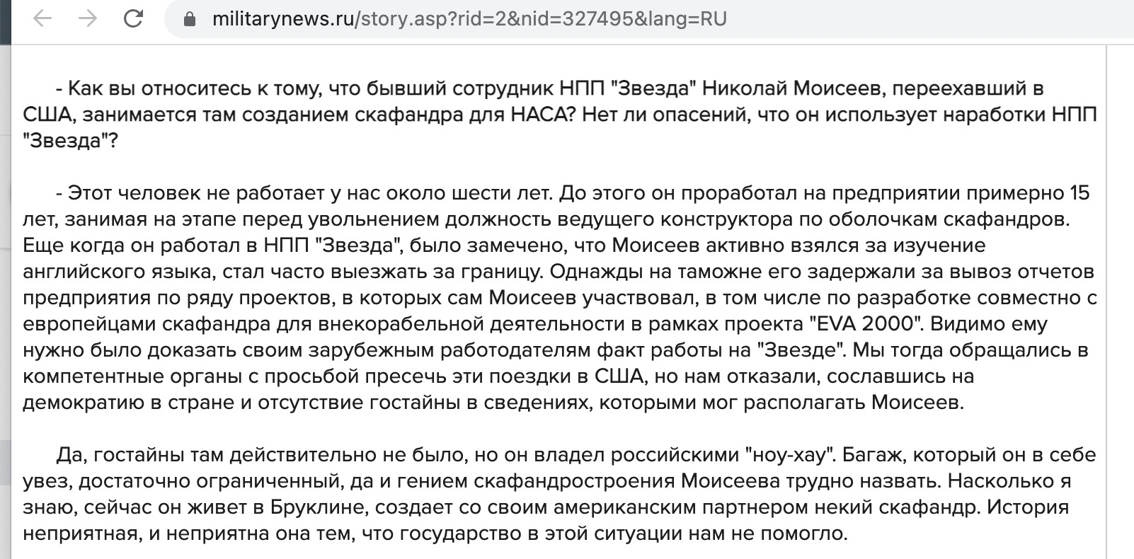 Николай 20 лет отработал в НПП «Звезда», единственном производителе скафандров в РФ. Затем переехал в Нью Йорк и создал скафандровый стартап Final Frontier Design.