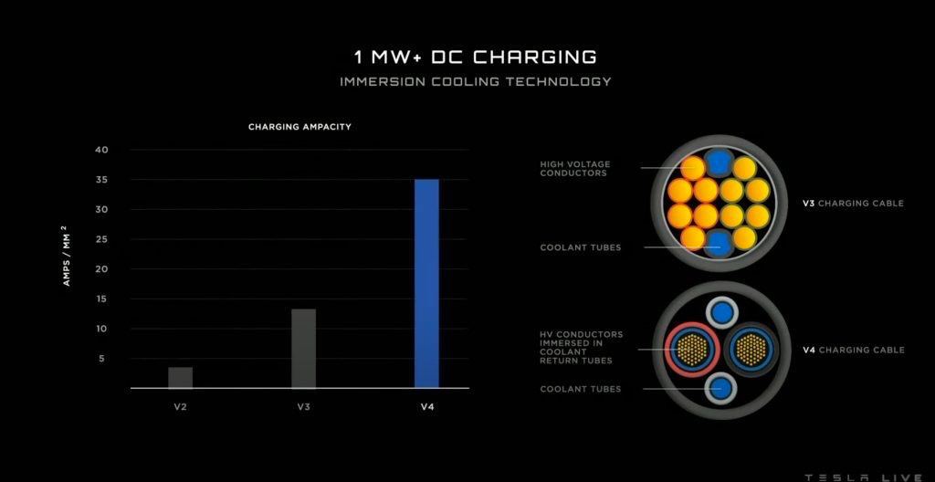 Будучи новатором, Tesla разработала технологию погружного охлаждения нового поколения для мегаваттного зарядного устройства Semi. Зарядный порт имеет высоковольтные проводники и трубки с охлаждающей жидкостью. «Это жидкостное охлаждение. Вы можете взять небольшой кабель, и он будет выдавать мегаватты. Мы увеличили плотность тока в 3 раза», — пояснил Илон Маск.